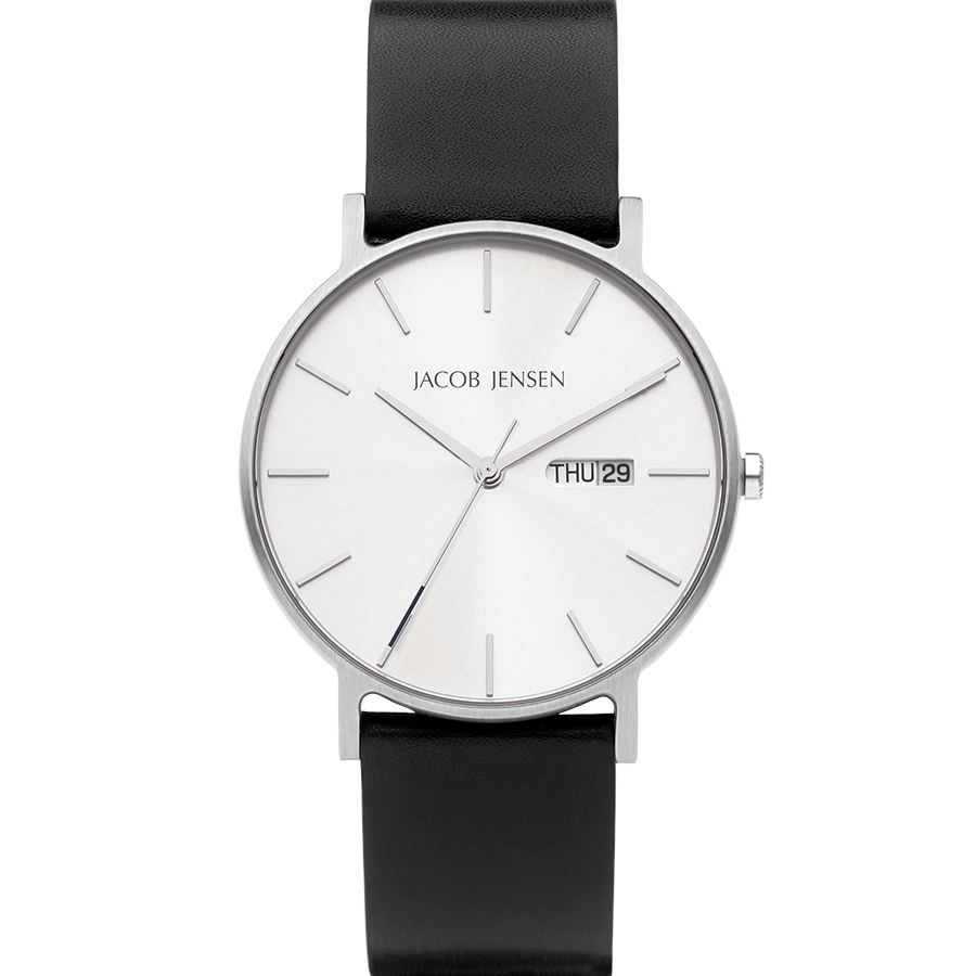 Jacob Jensen Timless Nordic JJ160. A great watch made from durable and strong materials. The titanium watch case is skin-friendly and also very lightweight. The 40mm wide JJ160 watch also features a sapphire crystal, stripe index and a reliable quartz movement. The leather strap is flexible and can be adjusted in different sizes.