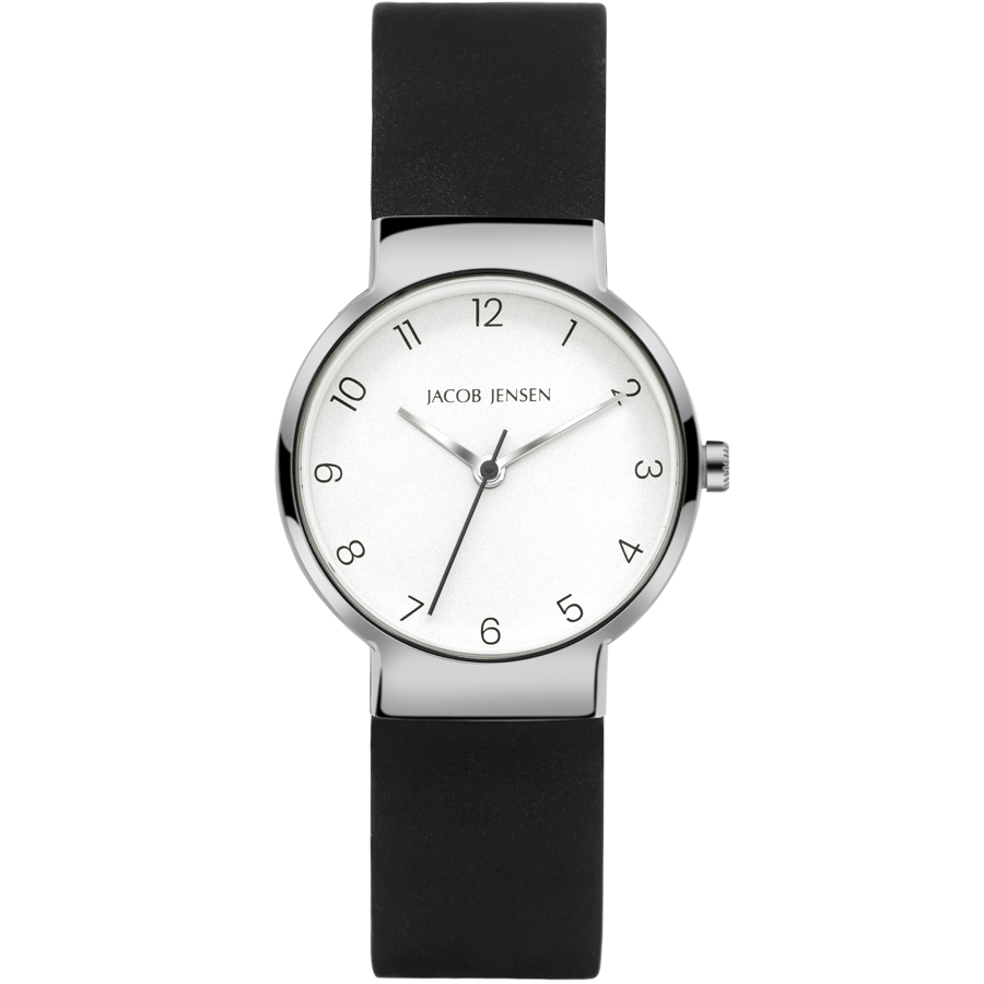 Jacob Jensen Timless Nordic JJ191. A great watch made from durable and strong materials. The titanium watch case is skin-friendly and also very lightweight. The 29mm wide JJ190 watch also features a sapphire crystal, stripe index and a reliable quartz movement. The rubber strap is flexible and adjustable in different sizes.