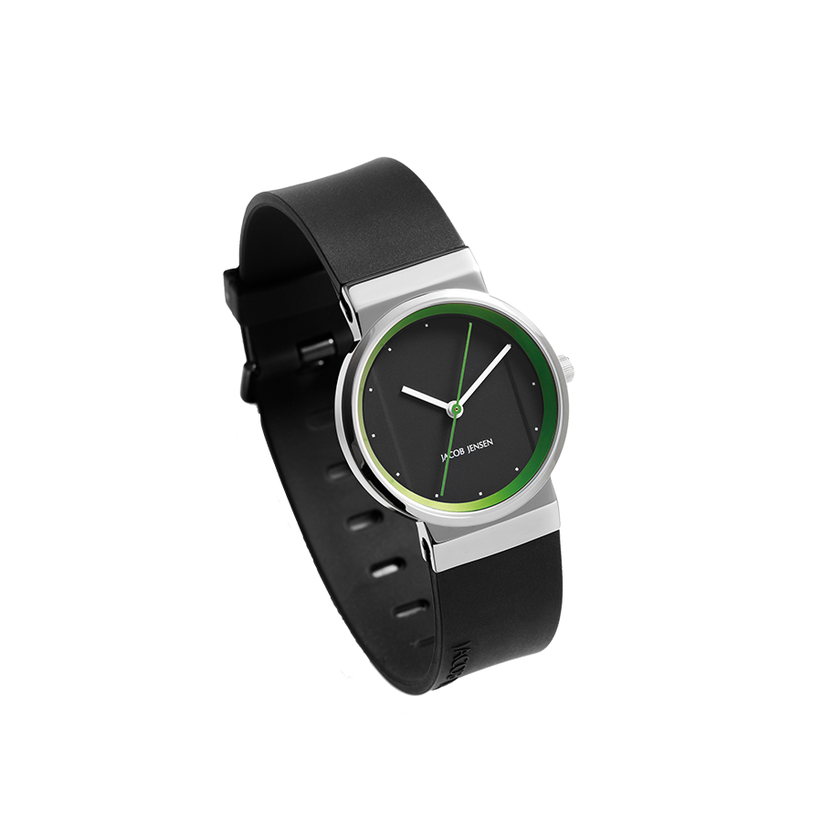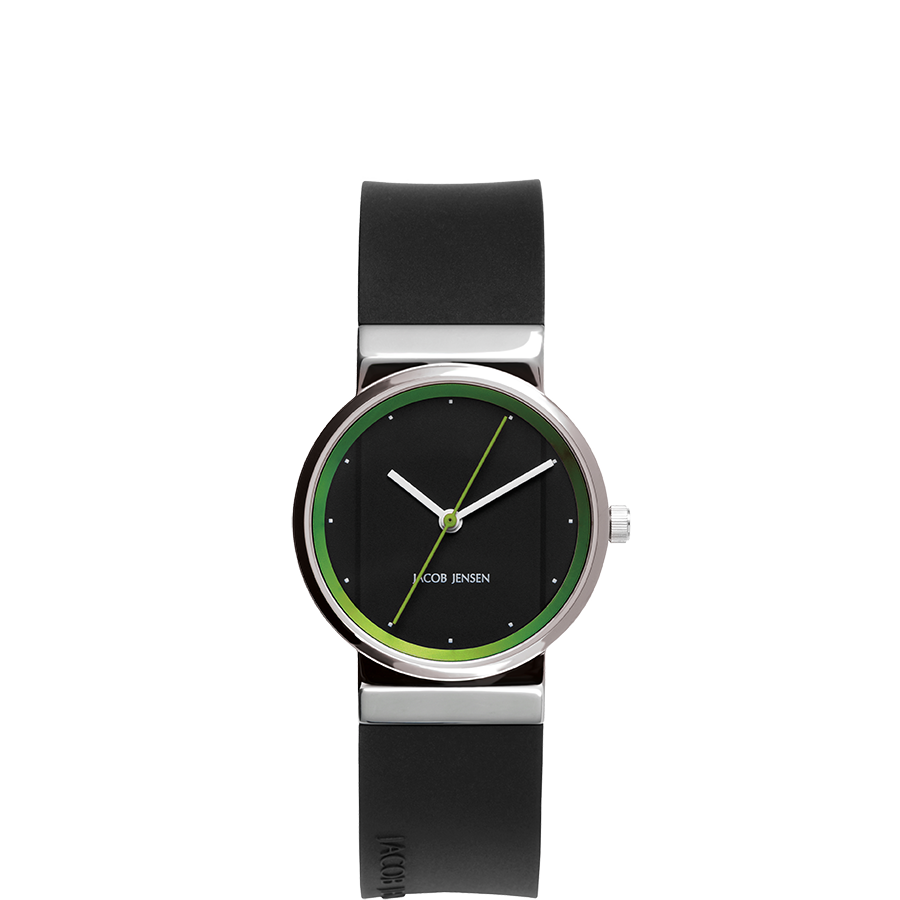 Its dial color is black with green edges and silver dot index, while its stainless steel case is round and silver in color. The JJ767 watch is analog and has a quartz movement. The elegant JJ767 ladies’ watch combines great design with superb-quality features. The design of the JACOB JENSEN New Series has been revisited three times since its release in 1995, resulting in some subtle yet significant changes to its design. The inner face of the watch has got a vertical dropped groove, which extenuates its three dimensional quality. It amplifies the illusion of the strap flowing seamlessly around the watch face. The updated models are available in 39 mm, 35 mm and 29 mm watchcases.